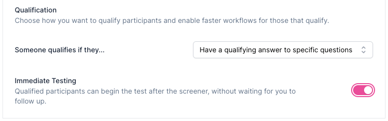 Immediate Testing: For Unmoderated Test Studies, enable 'Immediate Testing' to automatically redirect qualified participants to begin the test after the screener.