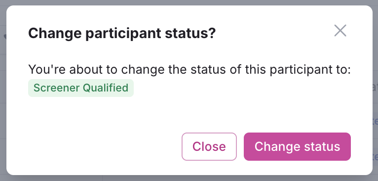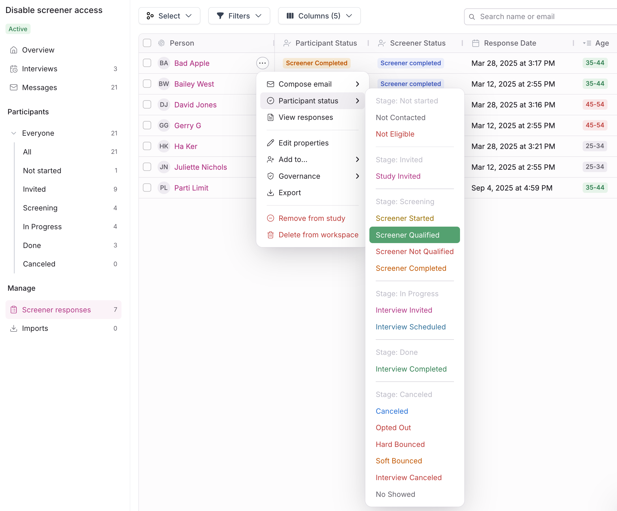 After reviewing responses, hover over their name again to select the 3 dots ... and Participant status and determine based on their responses whether they should be updated to "Screener Qualified" or "Screener Not Qualified".