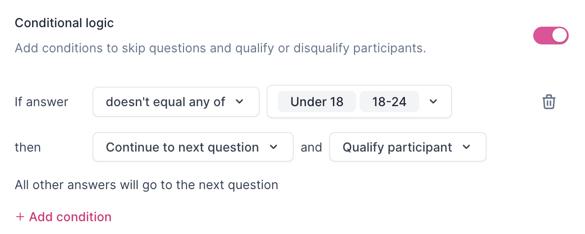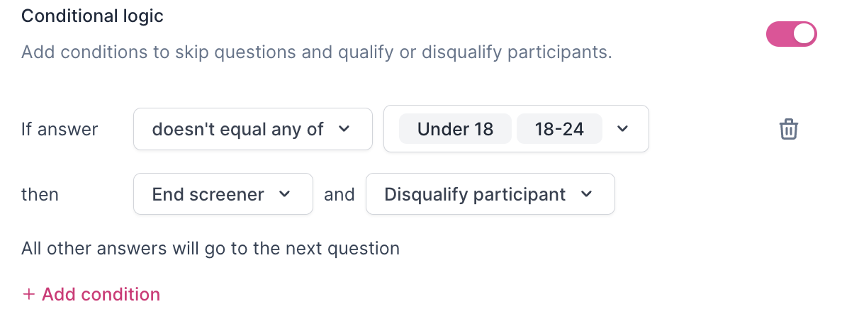 IMPORTANT: Add Conditional Logic to relevant screener questions to ensure participants are correctly auto-qualified or auto-disqualified based on the "Someone qualifies if they..." option set at the top of the screener.