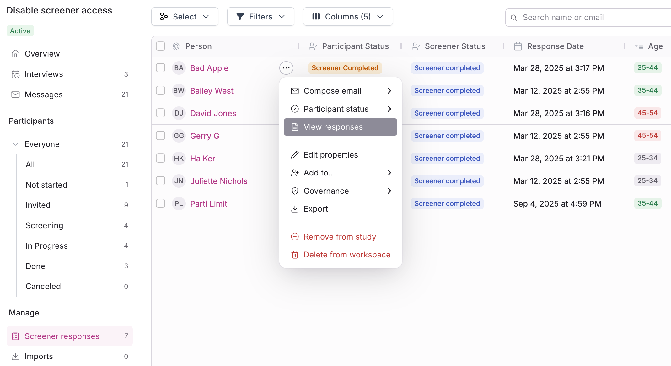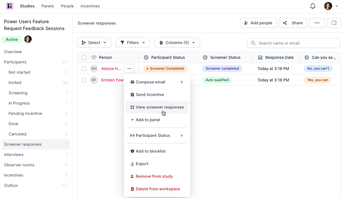 Hover over a participant's name to select the 3 dots ... and View responses to display their screener answers for evaluation.
