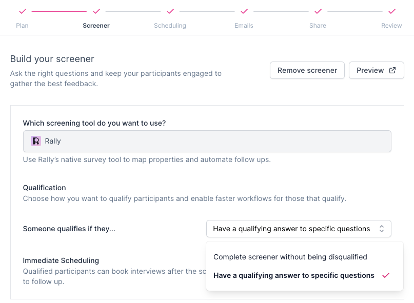 In the Screener step of Study setup, choose your preferred qualification method to streamline the workflow for qualified Participants. This can save you and your teammates time by not having to manually qualify Participants.