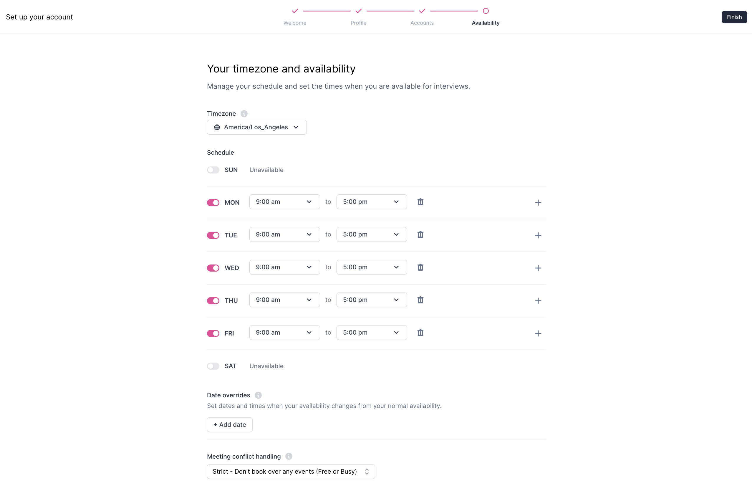 Set Your Timezone and Availability: Manage your interview schedule by setting your timezone, available time slots, and how to handle meeting conflicts.