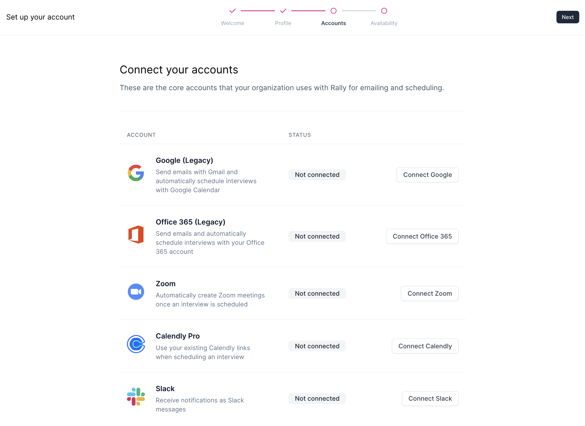 Connect Your Accounts: Link your relevant accounts to Rally for enhanced functionality. Send emails, create calendar invites, and receive notifications.