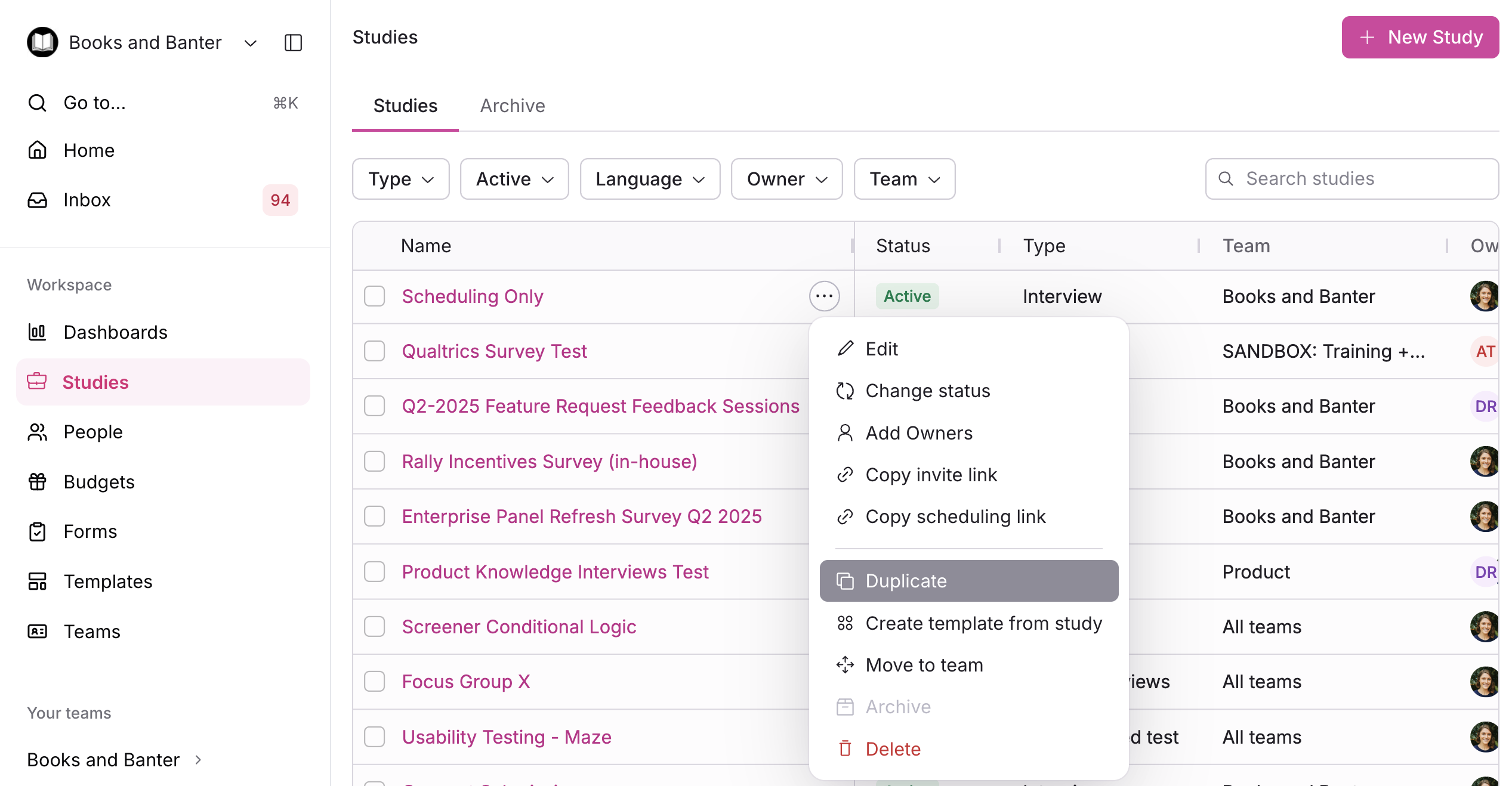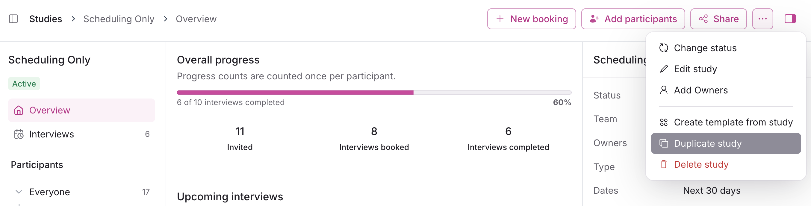 Duplicate an existing study to run continuous research with the same study setup, without having to start from scratch. If you plan to reuse the same study again in the future or want to make it available to your team, you can Create Study Templates.