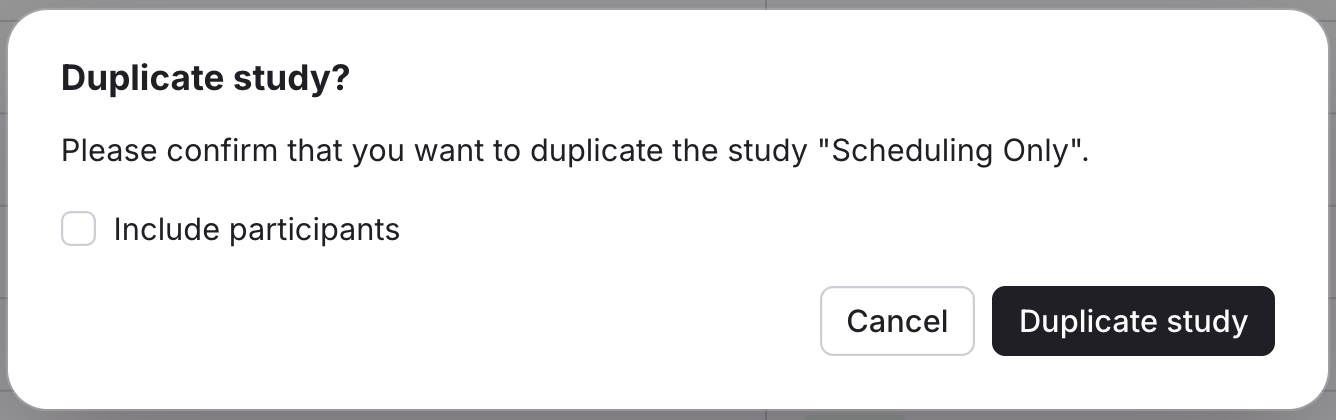 In the popup, you can optionally select the Include participants? checkbox to include all participants from the original study in the new duplicated Study.