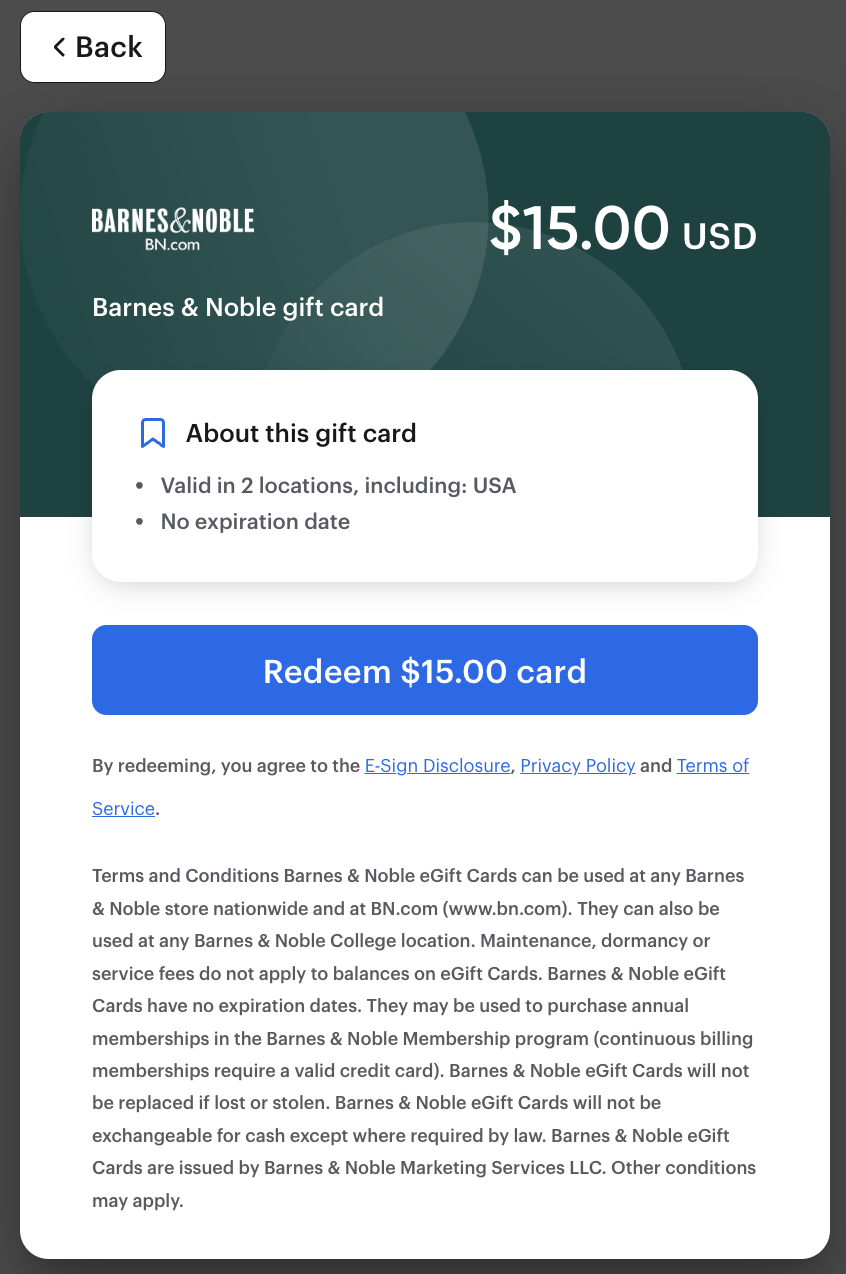 The recipient must always confirm the option they choose by clicking Redeem again. The relevant expiry details, merchant information, and Terms and Conditions can all be reviewed before the recipient finalizes their selection.