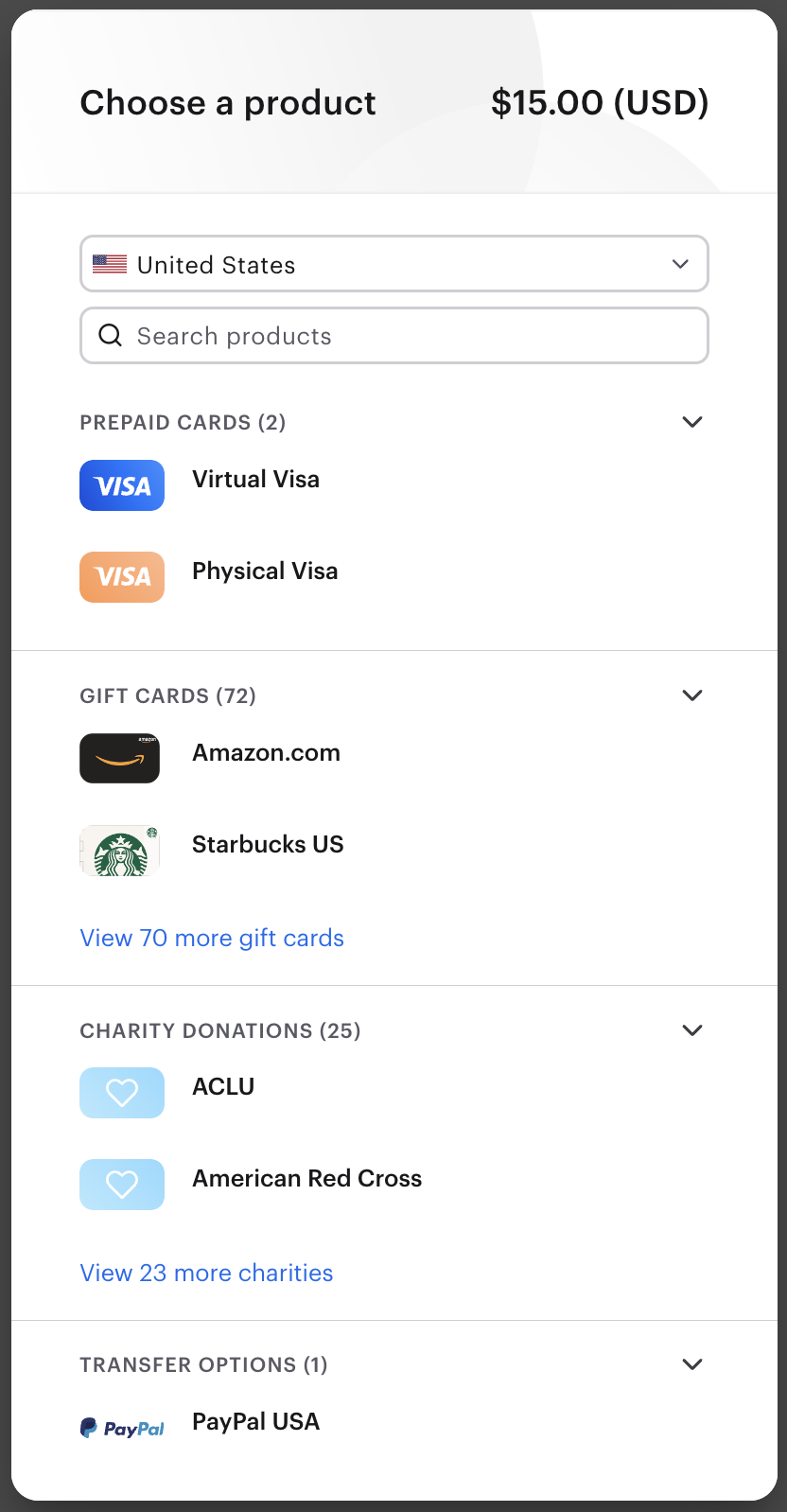 They'll be presented with a list of options available in their redemption region. Tremendous auto-detects the redemption region based on their IP location. They can browse all currently available options in their country, including Charity Donations, and make a selection. (There's still 1 more chance to change selections after!)
