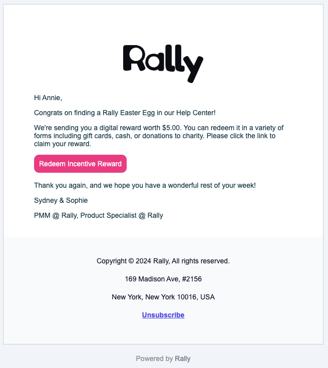 They click the button/link in the email, which takes them to a Rally page with a Claim reward button.