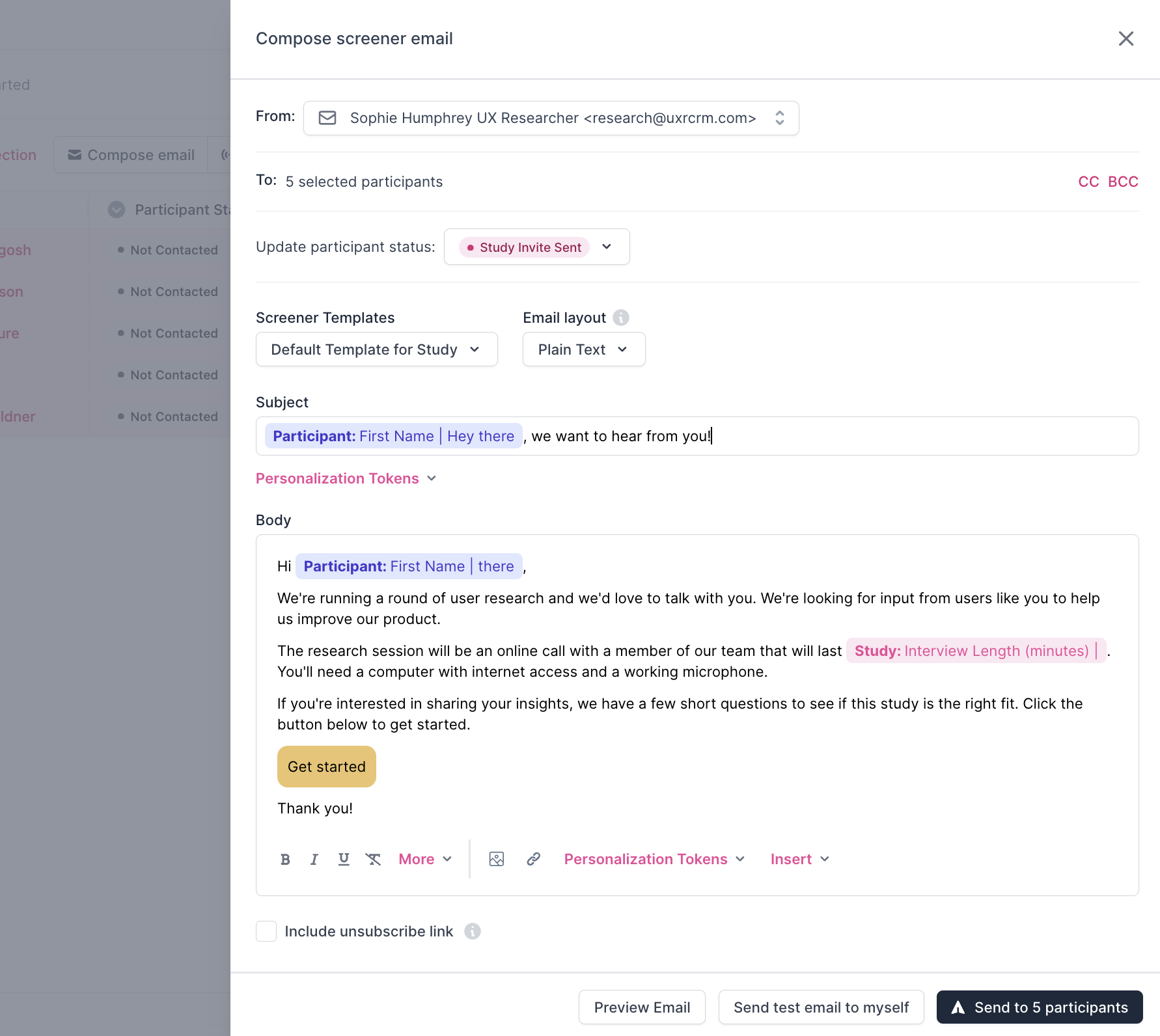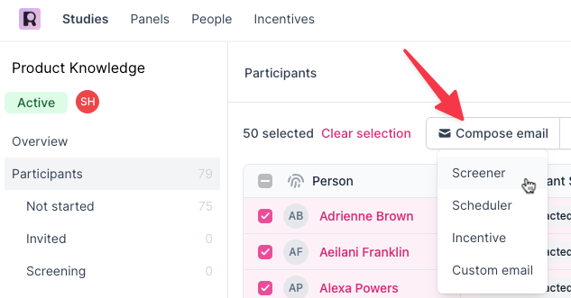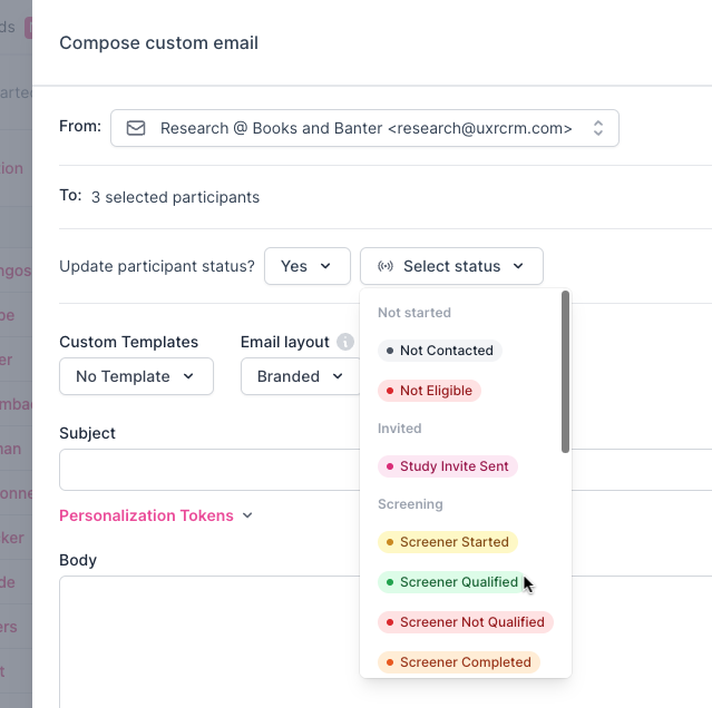 🚨 Use your discretion when sending custom emails, as custom emails will not automatically update Participant Status (in Studies) or Contact Status (in People via your workspace's governance rules). Learn more below.