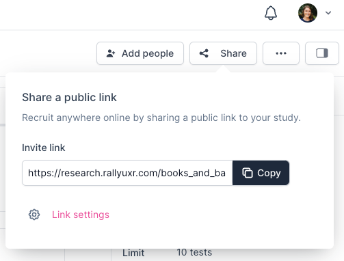 Invite Link: This link can be shared to recruit anywhere online and allows Participants to sign up and qualify for the Study through a Screener.