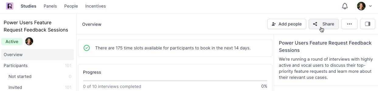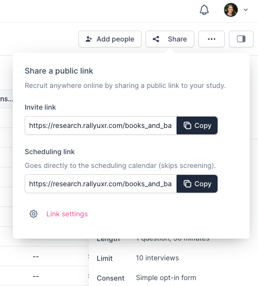 Scheduling Link: This link invites Participants to directly schedule an interview for the Study, and is only included in Interview Type Studies.