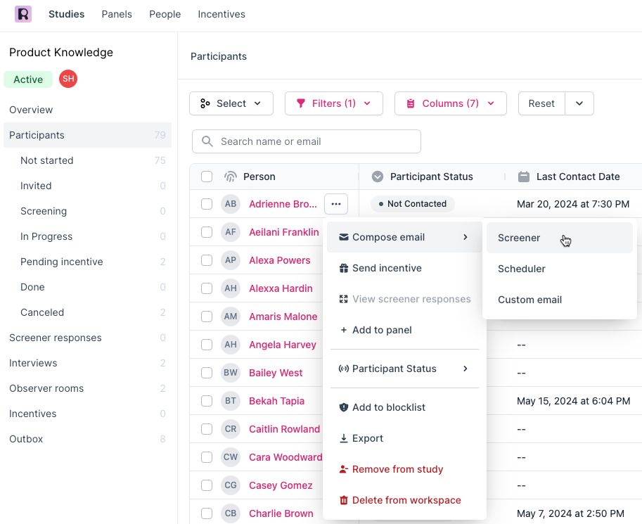 A person's Participant Status (shown in people tables within Studies) begins as "Not Contacted". Sending Study invite emails (such as the screener, survey, scheduler, unmoderated test, or incentive emails set up during Study creation) will automatically update their Participant Status, whereas inviting Participants to a Study with custom emails will not affect their Participant Status or Contact Status.
