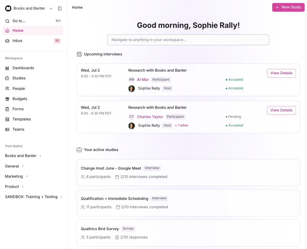 Your home page in Rally gives you immediate access to your most important work and provides quick navigation across your workspace. This centralized dashboard helps you stay on top of upcoming interviews, active studies, and enables fast site-wide search.