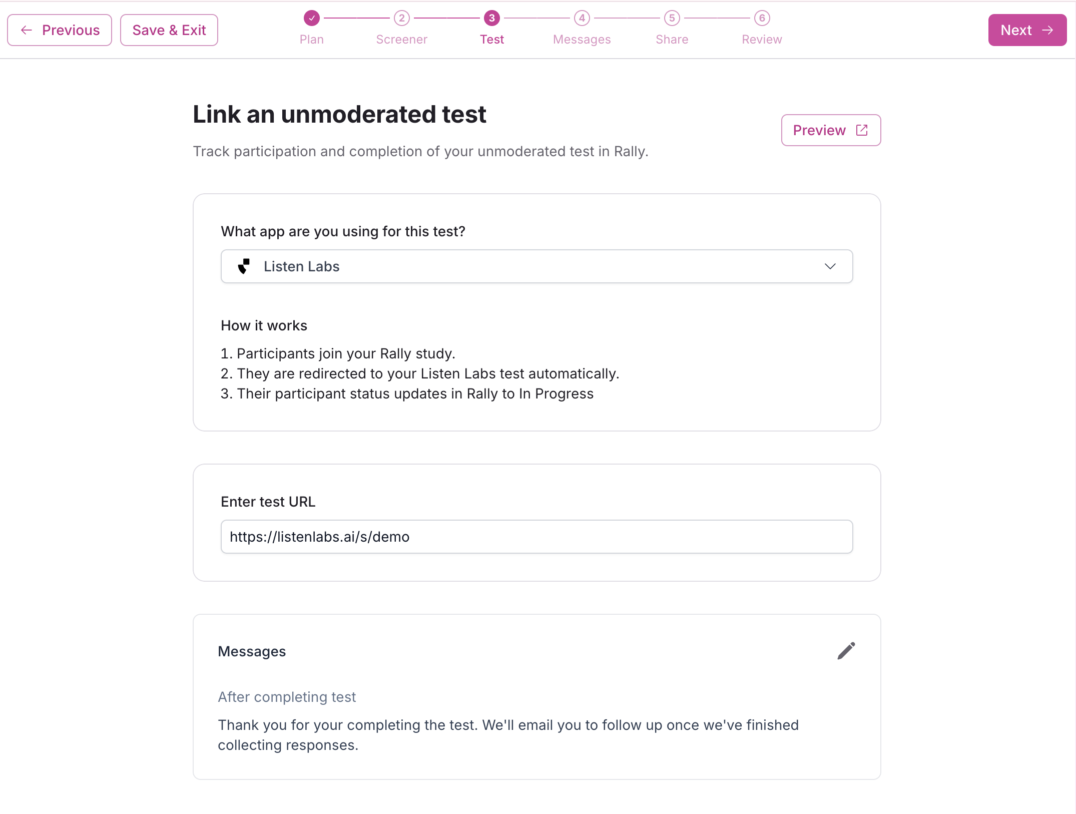 There's no special setup required in Listen Labs or Rally, you just need to enter the Listen Labs share link in your Rally Study. Your participants will be automatically marked as completed in Rally when they reach the end of the Listen Labs test.