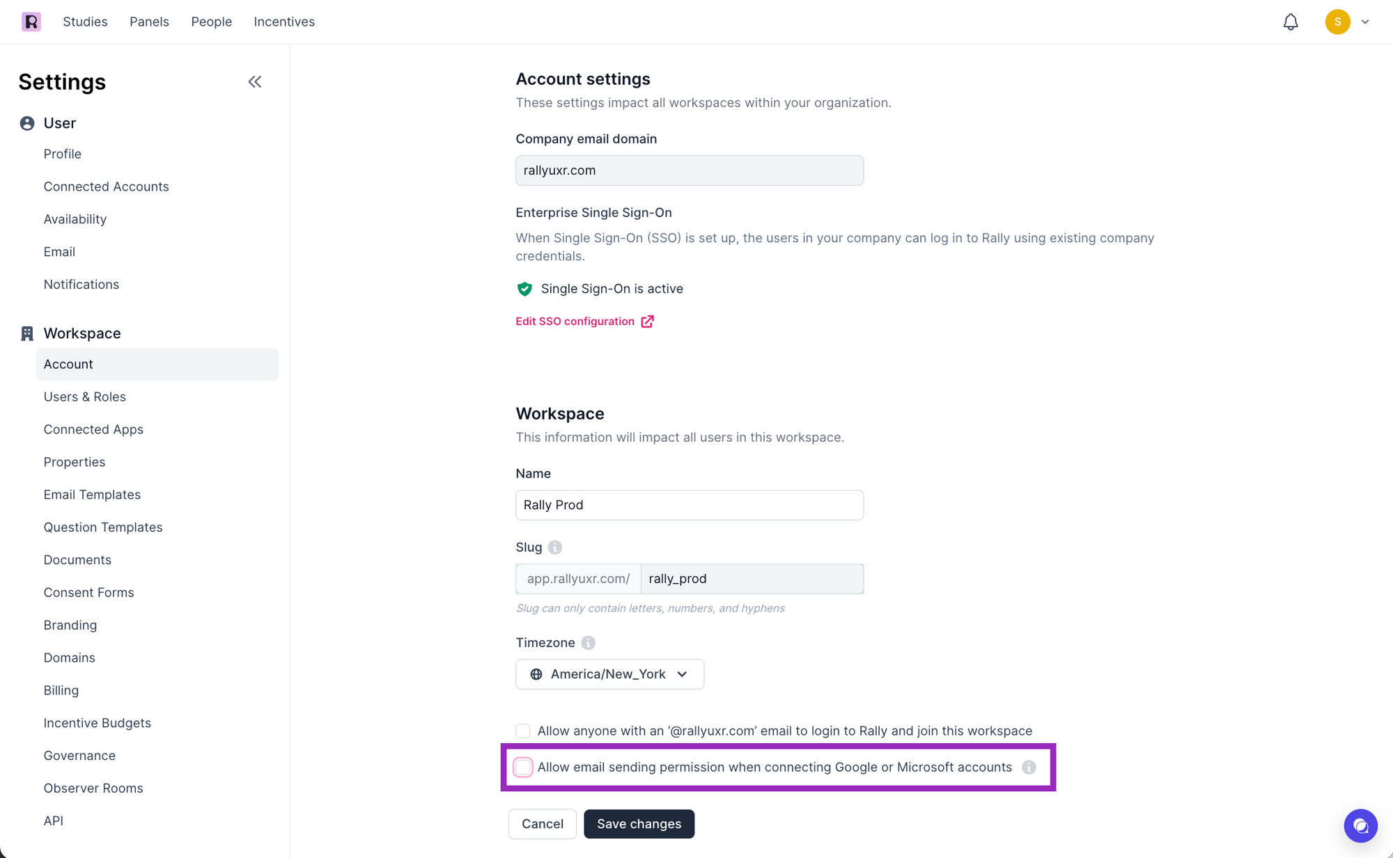 Navigate to Connected Accounts in Settings: https://app.rallyuxr.com/r/settings/connected-accounts