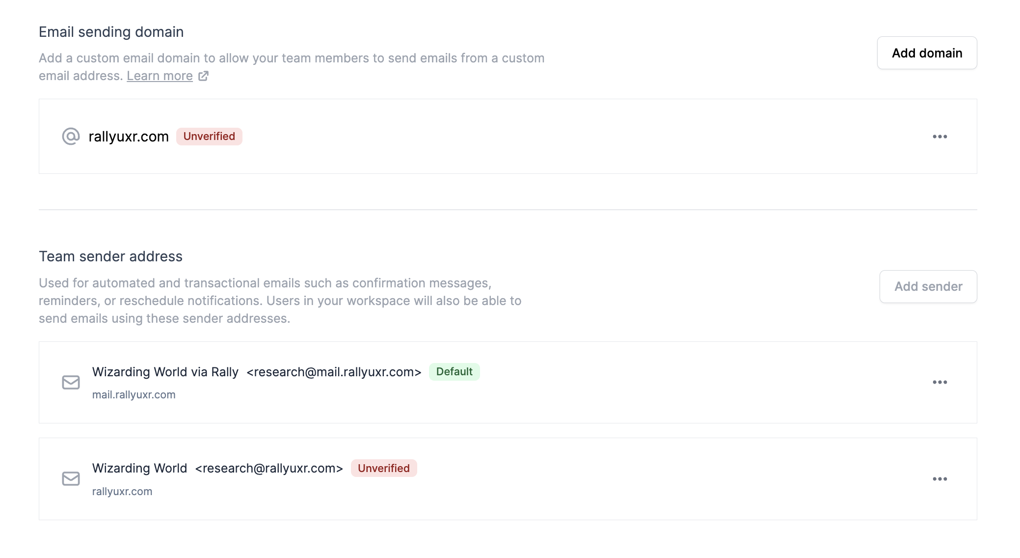 Once you have set up a custom domain, you can create team sender addresses. These addresses are used for automated and transactional emails, such as confirmation messages, reminders, or reschedule notifications. Team members in your workspace can also send emails using these sender addresses.