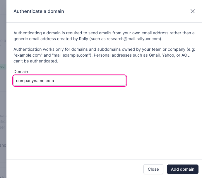 Domain authentication is necessary to send emails from your own company email address instead of a generic Rally email address. This process is applicable only to domains and subdomains owned by your team or company (e.g., "example.com" and "mail.example.com"). Personal addresses like Gmail, Yahoo, or AOL cannot be authenticated and will have stricter limitations of 700 emails sent daily, while custom domain emails can send exponentially larger numbers of emails daily.