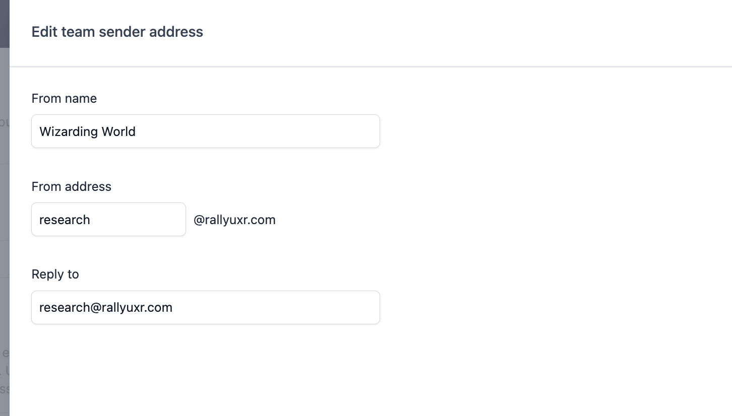 • Customize the email address your Participants see in their inboxes. Most customers prefer to show this is coming from their research team, such as "research@rallyuxr.com" by entering "research" in the text field.