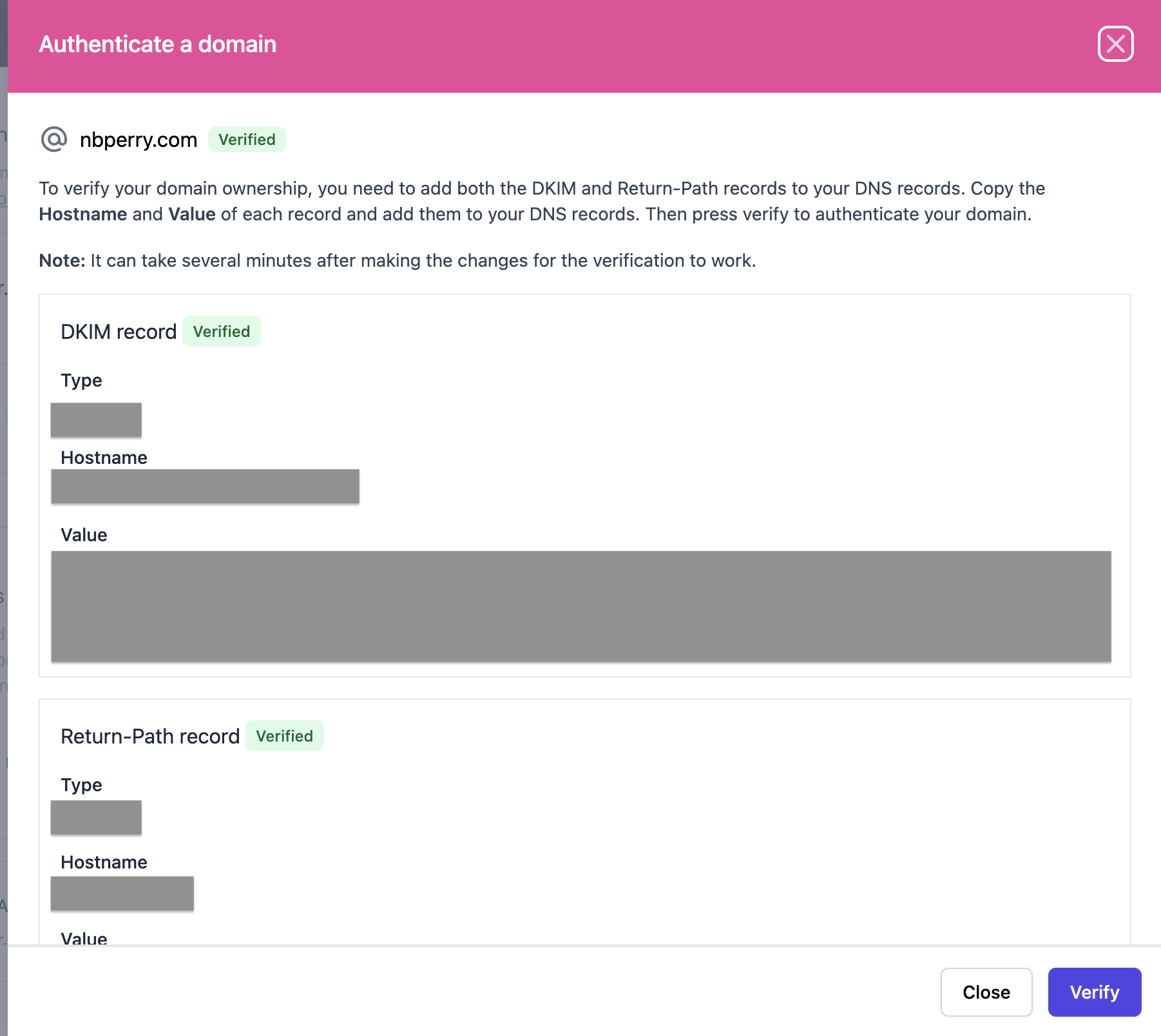 Lastly, After adding the records, click Verify in Rally to authenticate your domain. It may take a few minutes for the verification process to complete. If you are waiting on your IT support, you can click 'Close' and return to these steps later by clicking on the three dots and 'Verify domain'.