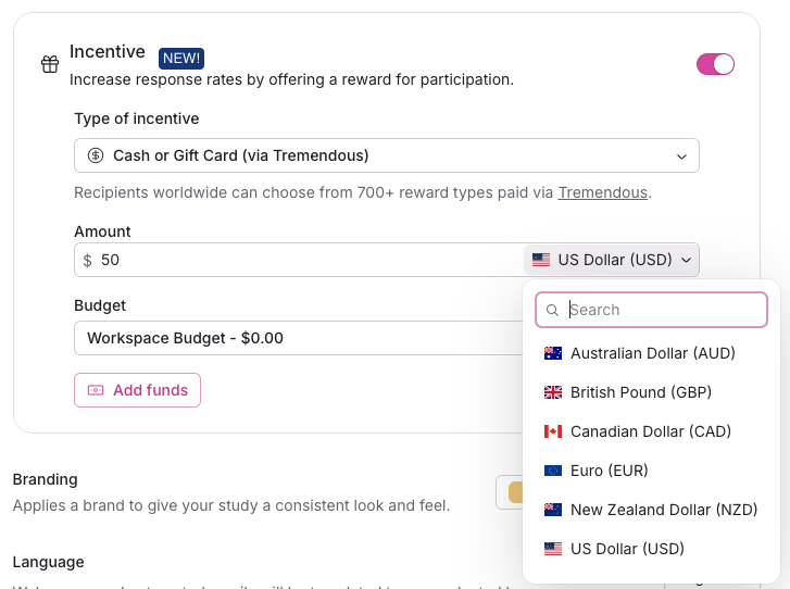We've added multi-currency support, allowing you to send incentives in a different currency, to better support companies based outside the US or regularly conducting research with specific location-based targeting.