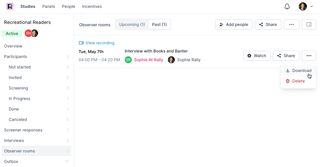 View, share, or download an Observer Room Recording easily from your Rally Study. A recording of the interview will be available after the call is complete. Team members will be able to view and share a link to the recording page at any time. Your workspace admin can configure who can download Observer Room Recordings in Settings (admins only, or admins and study teammates).