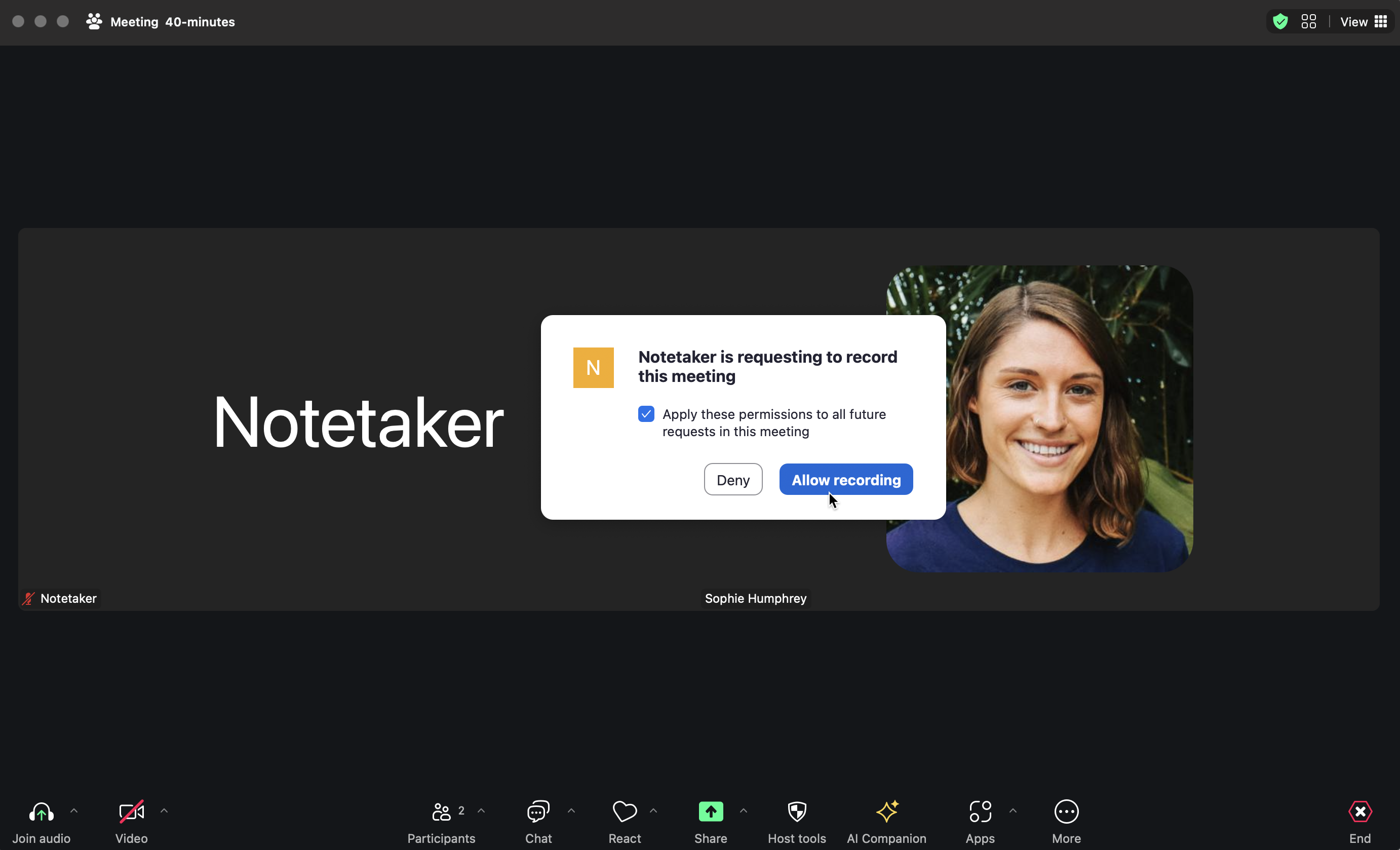 As the interview host, you'll ensure your interview is recorded by admitting the recording bot. We suggest joining your interview meeting before the start time to confirm you are all set. 5 minutes before each interview starts, a recording bot (automatically set to "Notetaker") will request to join the interview. It must be admitted by the host of the interview. The Notetaker automatically records the interview once admitted - no need to record the interview manually.