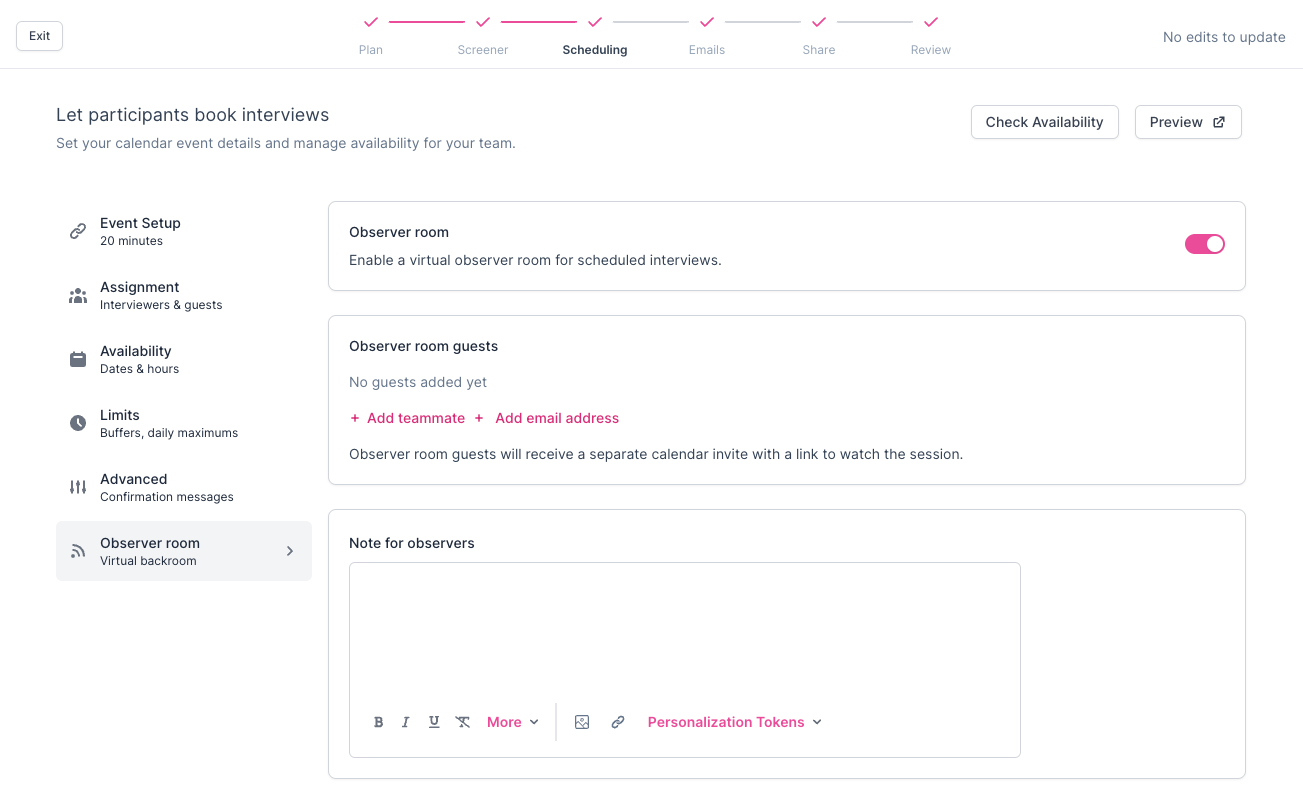 Ensure you have selected Zoom, Google Meet, or Microsoft Teams as the interview Location to enable Observer Rooms.