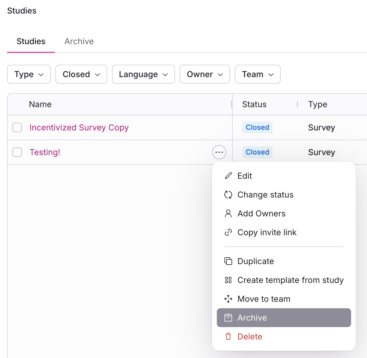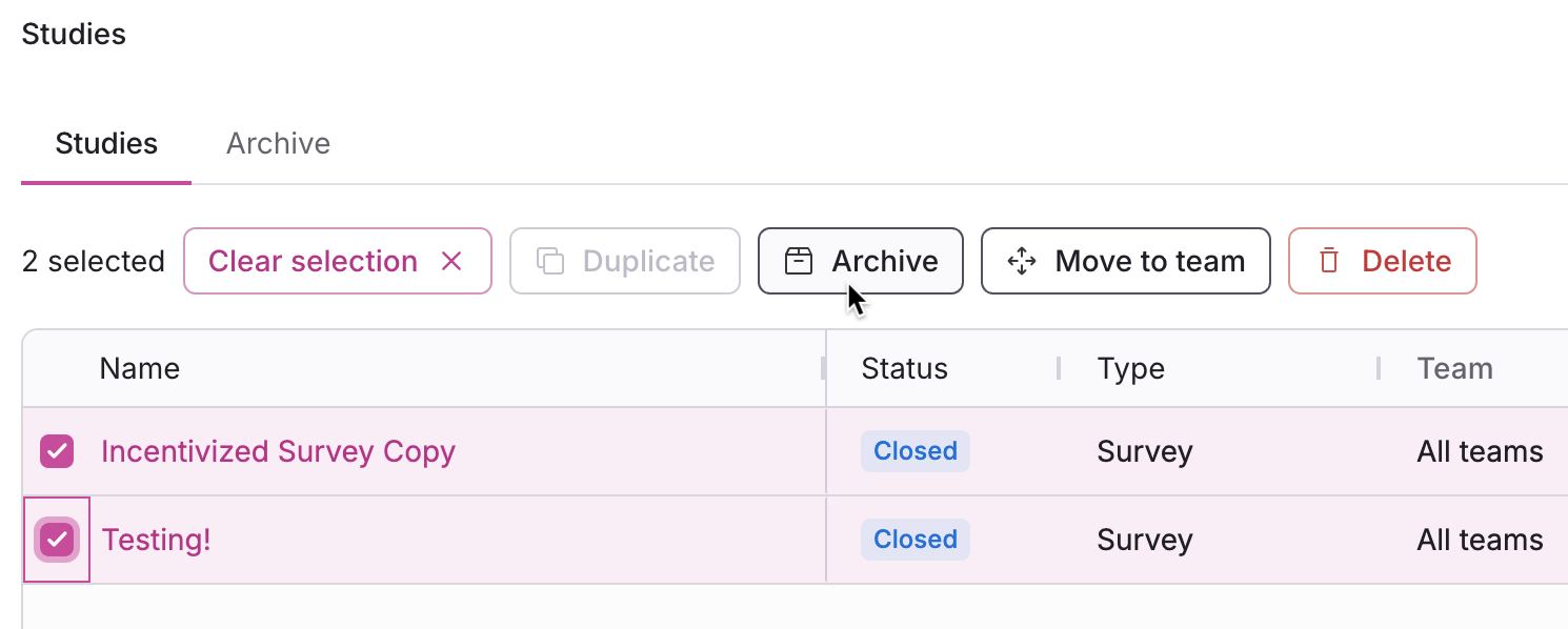 Archive your closed studies to clean up your studies page without deleting them. Participation history and data will be preserved, but participants will no longer be able to access any study components.