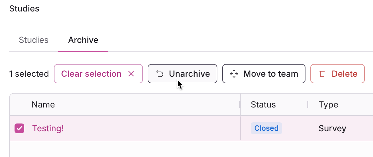 Accidentally archived studies can be unarchived and restored to your main studies page as closed studies. This also allows you to export study data again.