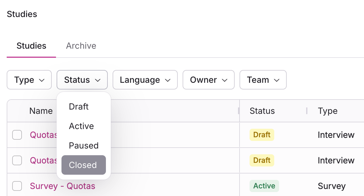 Learn more about Study Statuses and how to close a study before archiving it.