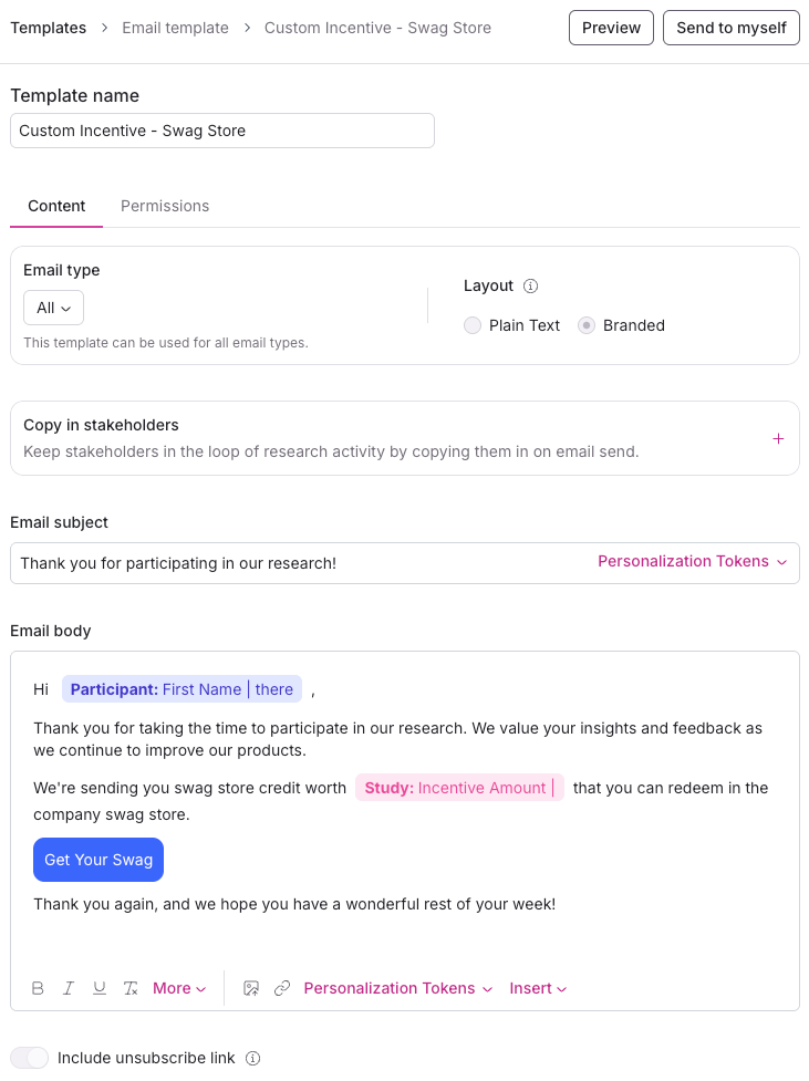 Create an email template for each custom incentive option you will be offering your participants. This will allow you to ensure consistency in how custom incentives are communicated to participants. This email template should be saved as “All” types and not the “Incentive” type.