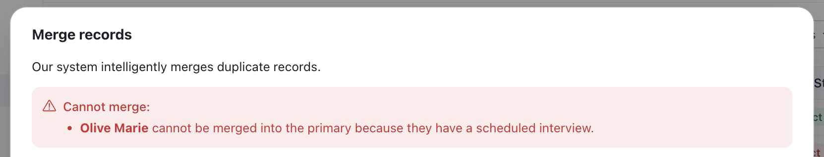 Easily merge two people records into a single record when participants schedule an interview with a different email or clean up accidental imports to combine profiles.