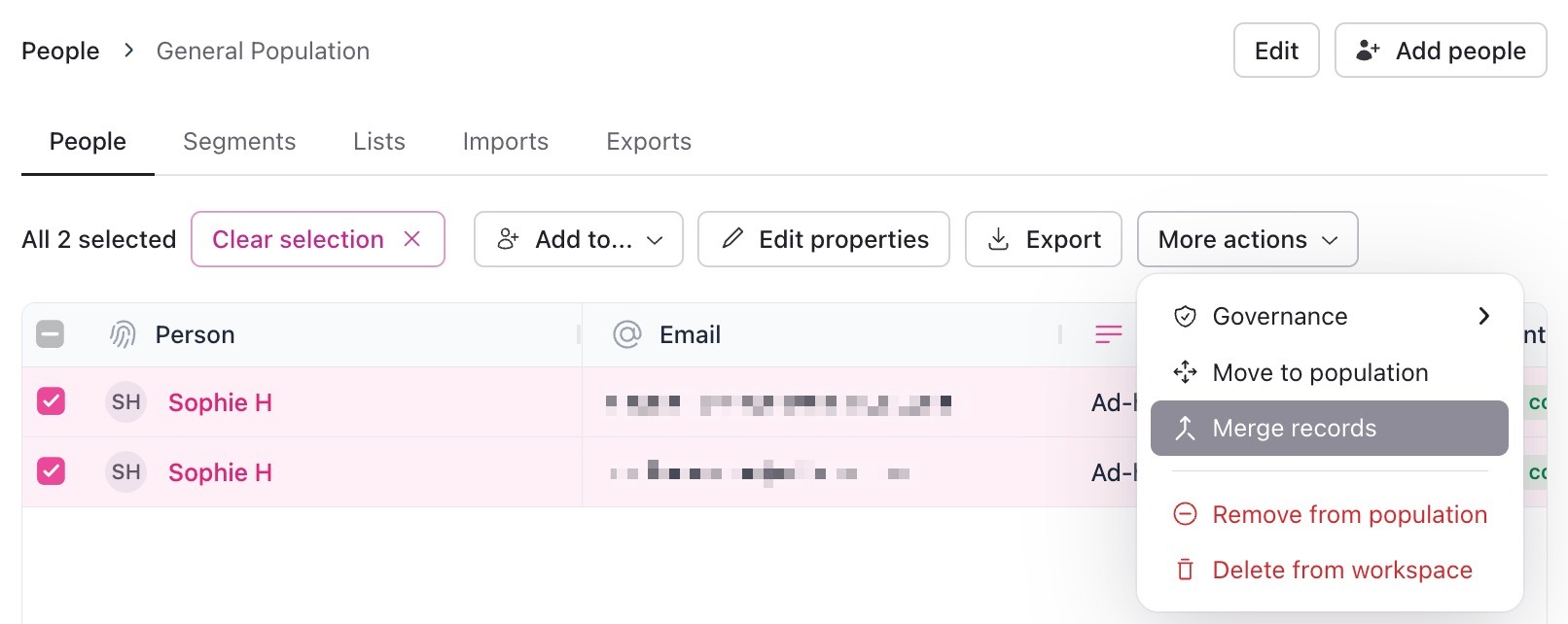 Search or filter a population or database and select the checkboxes for 2 people to combine.