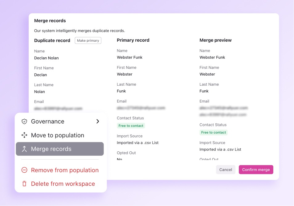 🚨 Merging records is permanent and can't be undone. The duplicate record will be deleted from your workspace, but if it belongs to any studies, forms, or populations, those memberships will be transferred to the primary record.