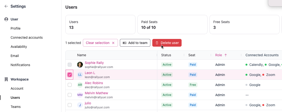 Delete User: Deleting a user will remove them from any Studies they are Study owners of. Participants will not be able to schedule any new interviews with this user. Outreach history, like sent emails, will be preserved but not tied to this user anymore. Deleted users will no longer be able to log in to Rally.