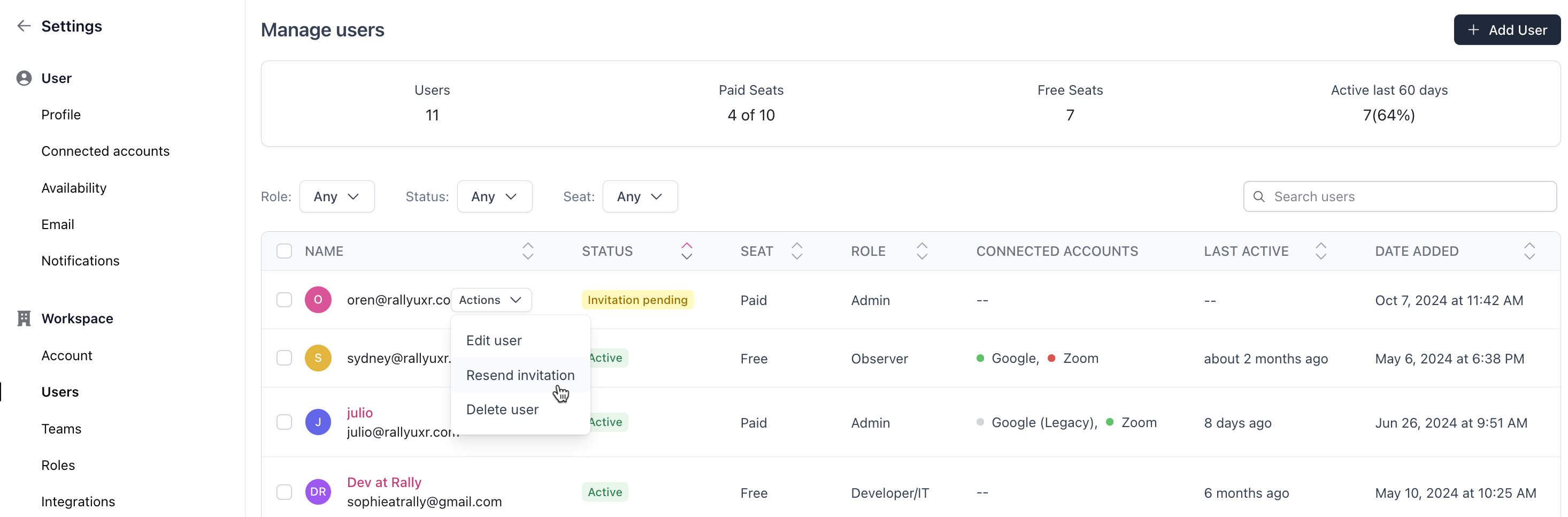 Resend Invitation: Option shown only for new users who have not yet accepted their invitation email and joined Rally.