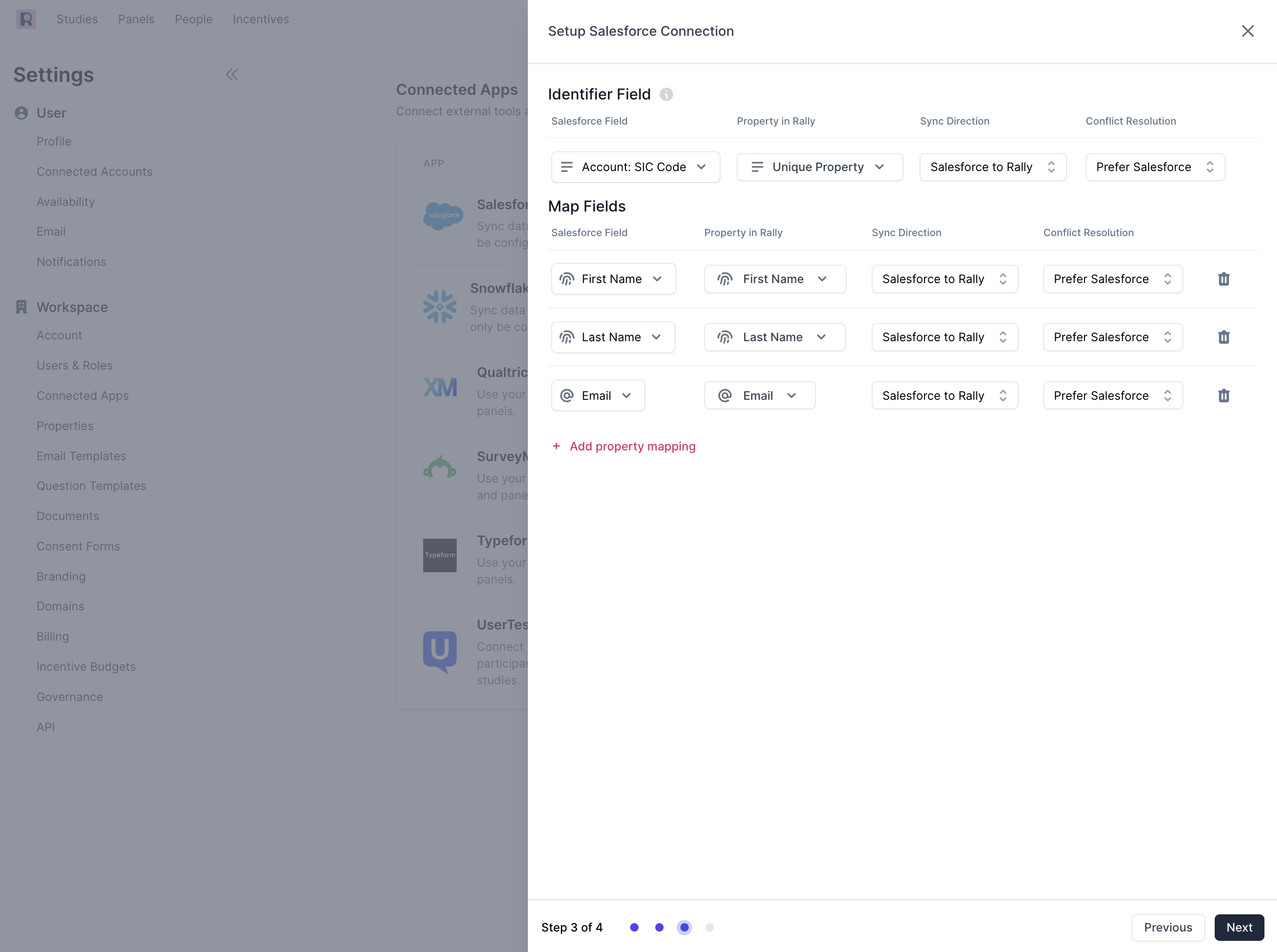 Enabling Rally to sync specific data back to Salesforce allows for research activities conducted in Rally to update your Salesforce database, keeping your organization aligned and ensuring data stays fresh. For example, we suggest syncing properties such as “Last Contact Date”, “Last Interview Date”, “Opted Out” status, or “Incentives Sent".