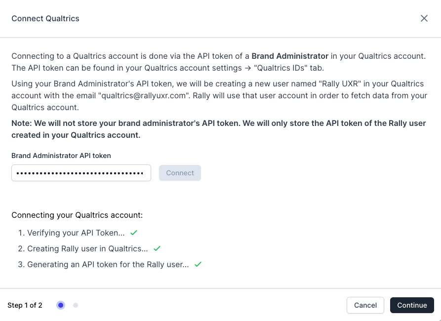 Note: We will not store your brand administrator's API token. We will only store the API token of the Rally user created in your Qualtrics account.