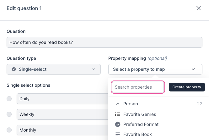 Select an existing Property from the dropdown to map the question to it. If the selected Property has options, you can also map each question option to the corresponding Property option.