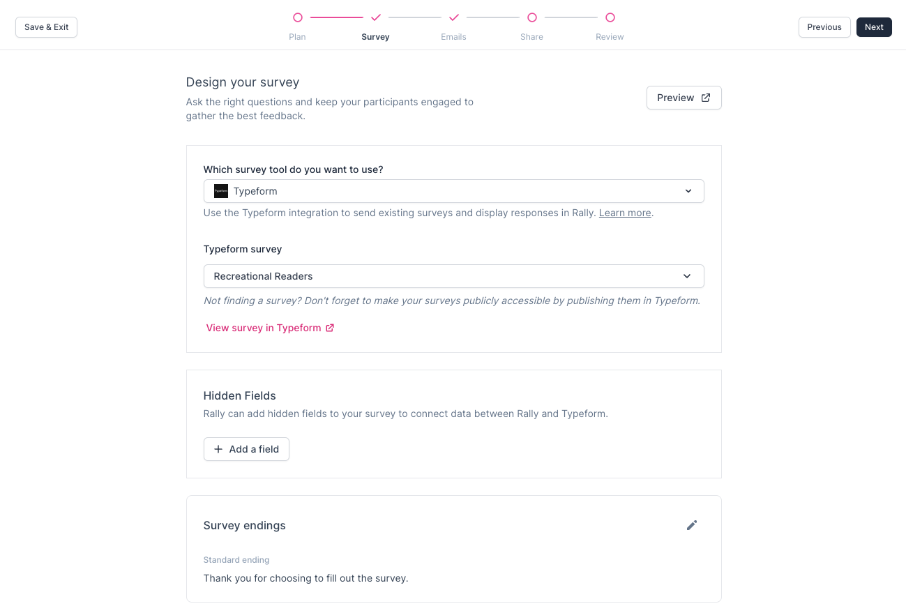 Now that you've connected your Typeform account to Rally, you are ready to use Typeform surveys in Rally Studies.