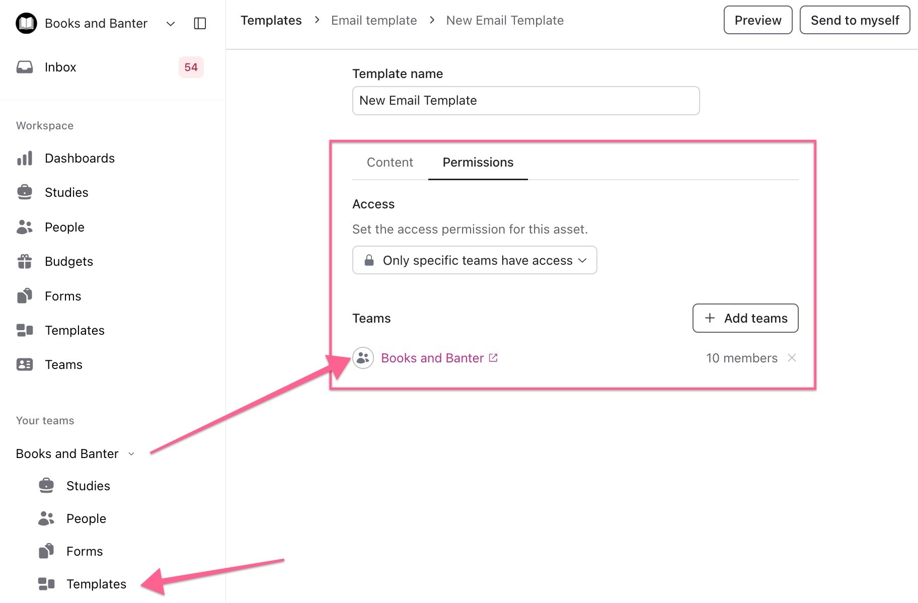 From the side nav bar, you can now select a team's name and Templates to view the templates they are assigned to, including all workspace wide and those assigned specific team access.