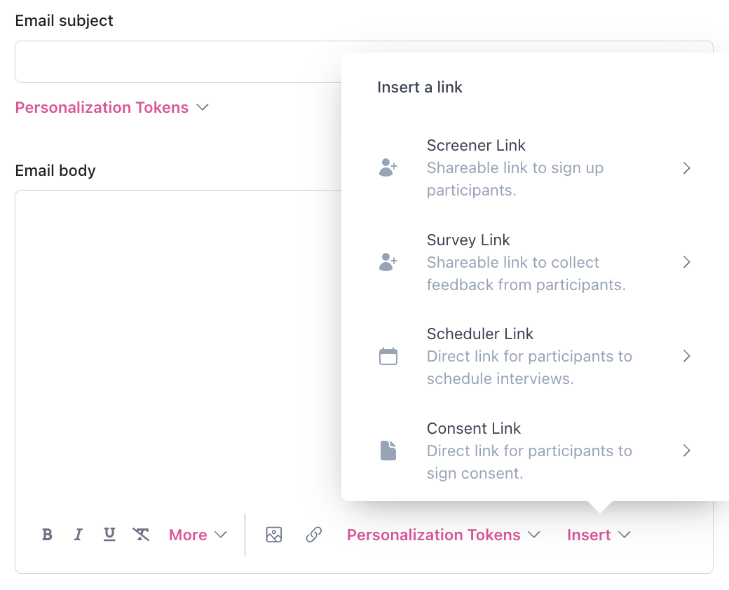 Where relevant, we suggest using Personalization Tokens within the body of the email. Personalization Tokens allow you to incorporate customized data points, such as Participant name or Study name, enhancing engagement and reinforcing your brand perception.