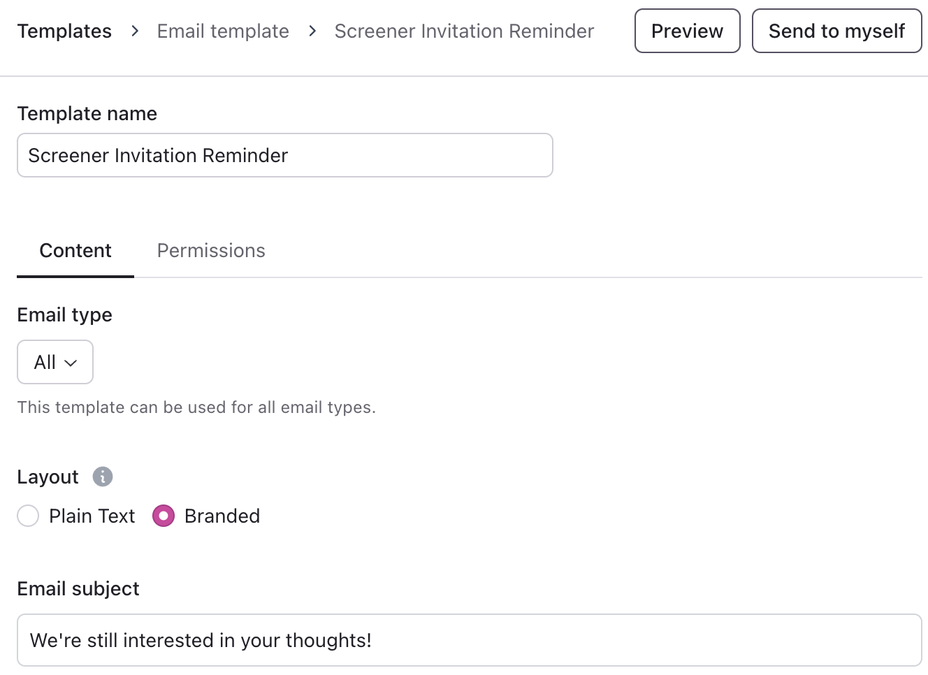 You can then select from premade Email Templates during the Email step when building a study and easily customize the details within for the research being done.