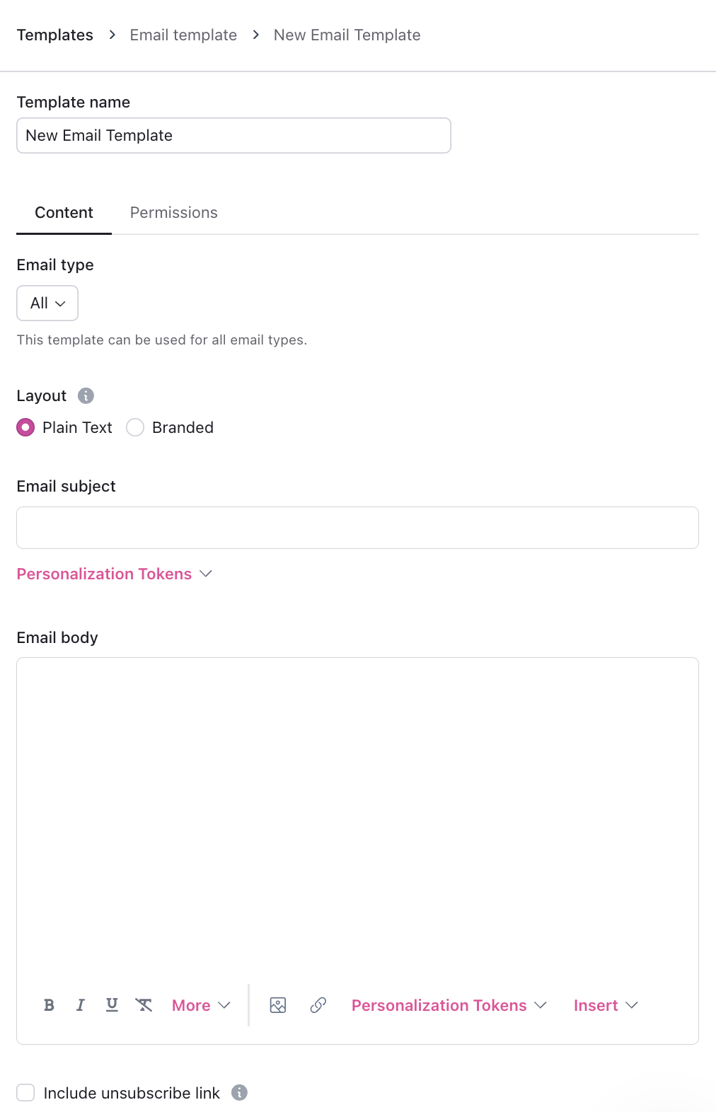Select the name of an email template to open it and begin editing. Make changes to the content, name, and more, or select the Permissions tab to change which teams have access to it. Save changes to apply.