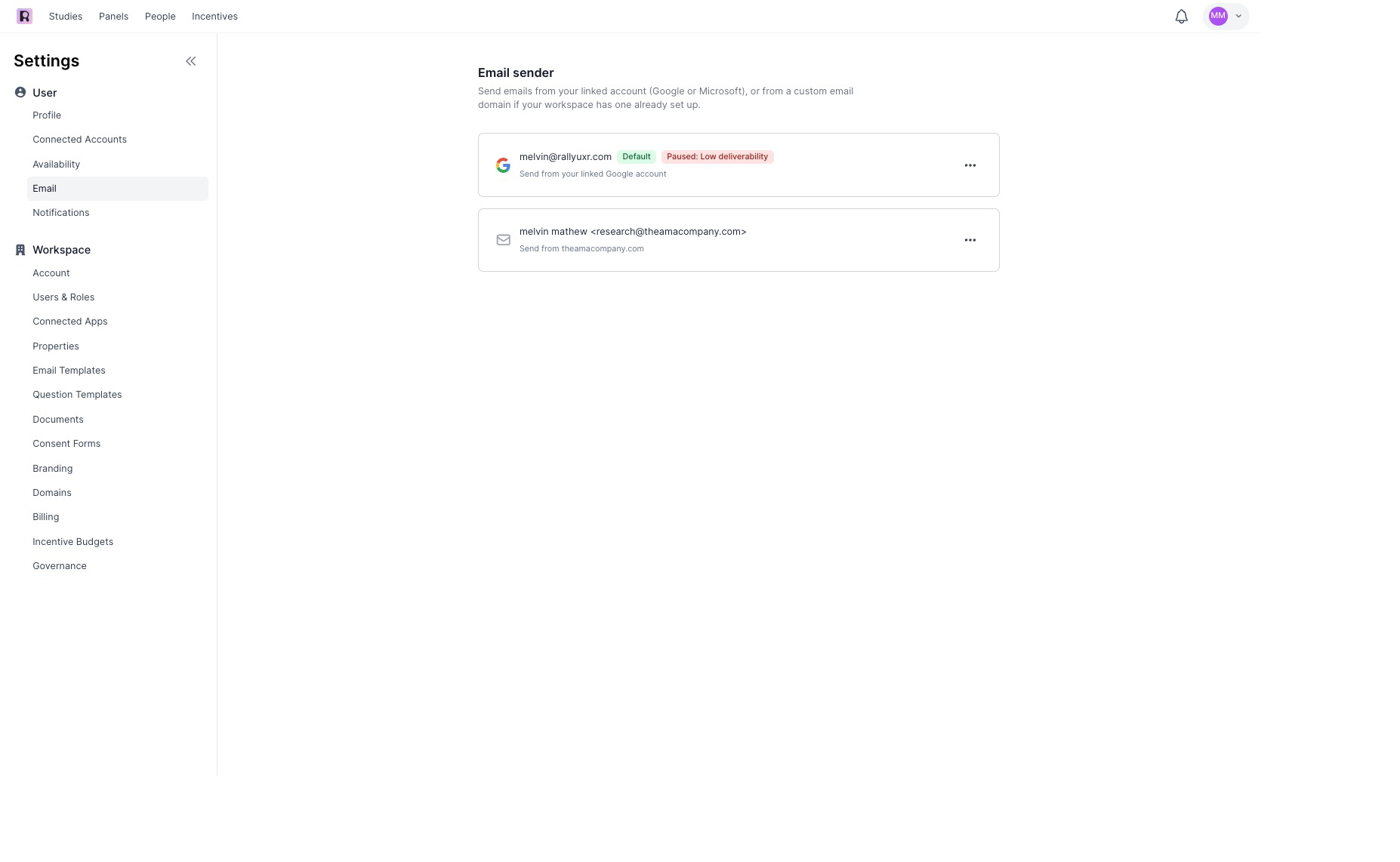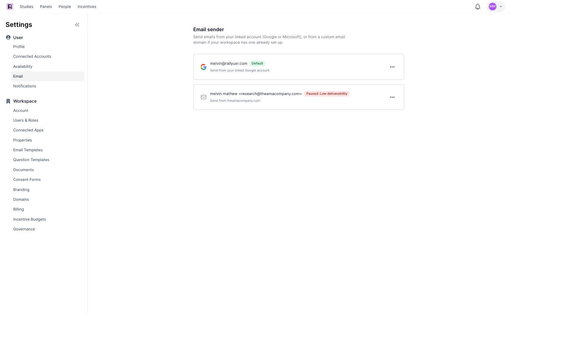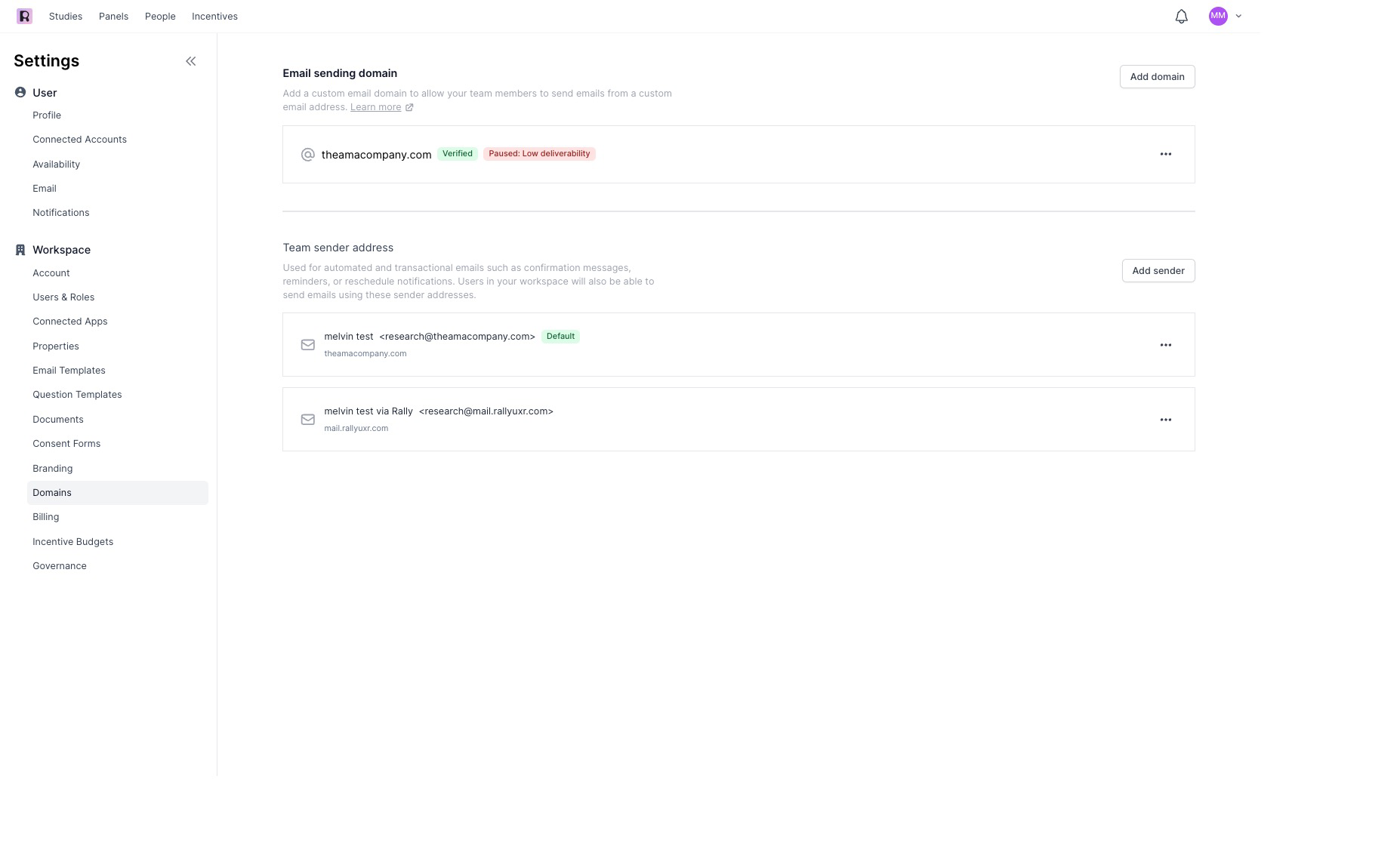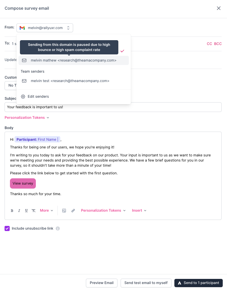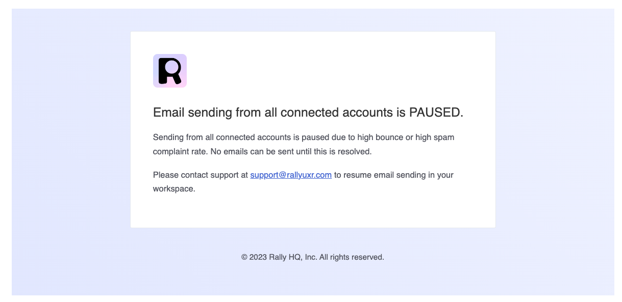 If the thresholds above are exceeded, email sending will be paused in your company’s workspace. Please reach out to the Rally support team if you have not done so already by using your direct support channel or emailing support@rallyuxr.com. We will work with your workspace admin to manually unblock your company’s domain in 2 week increments.