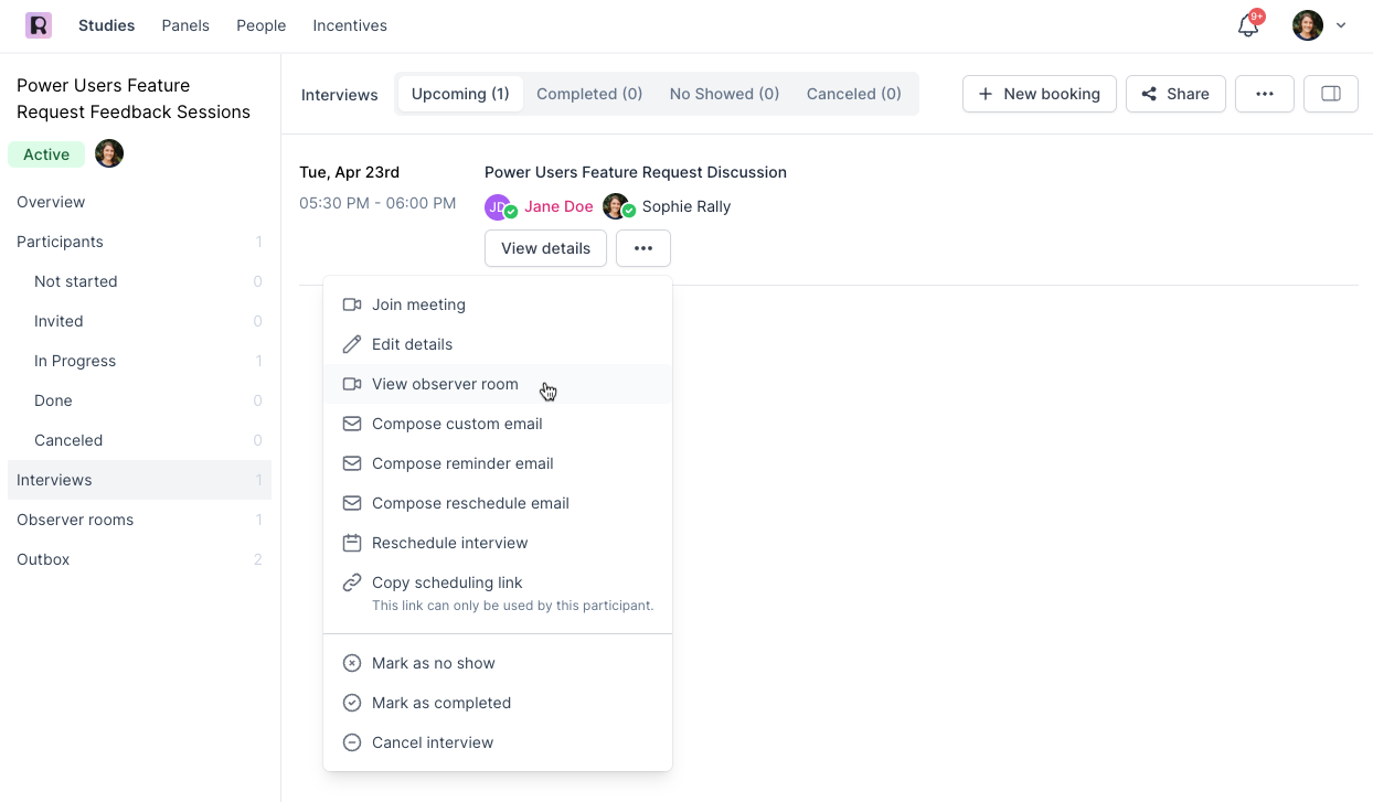 You can also share the link yourself by navigating to the Observer Room and clicking the 'Copy link' button. To reach the Observer Room for any interview, go to your Studyβs Interviews page, select the three dots for the interview you want to view, and select 'View Observer Room'. Switch between Upcoming and Completed interviews by selecting the tabs at the top.