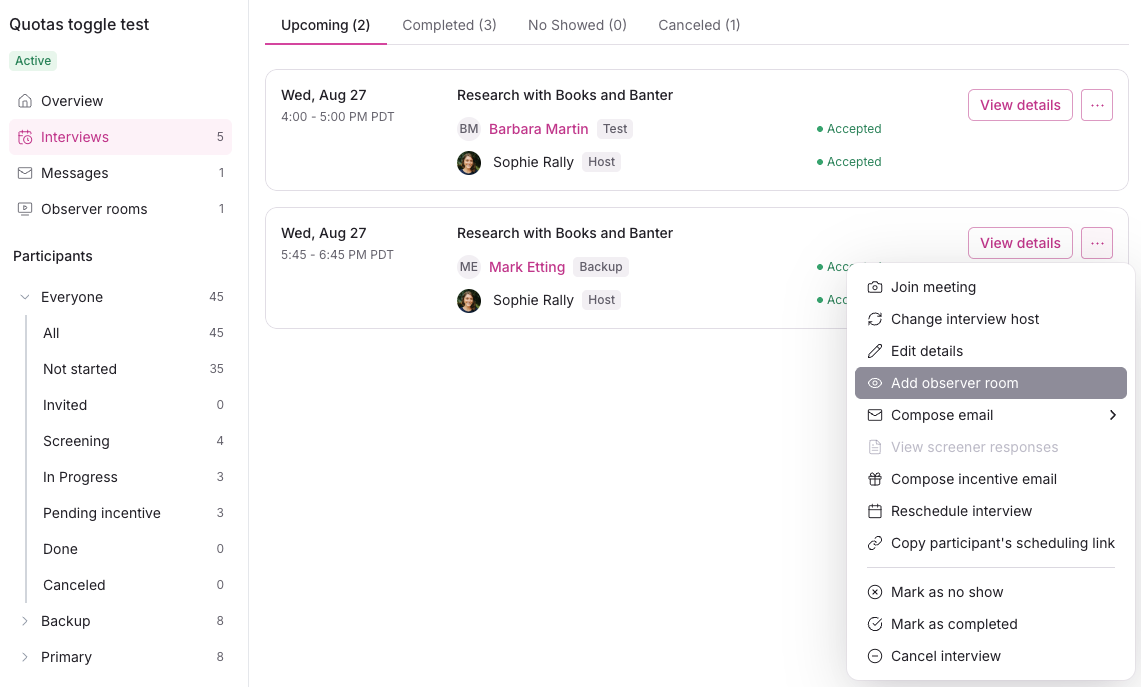 Repeat these steps for any interviews booked before Observer Rooms were turned on for this study.