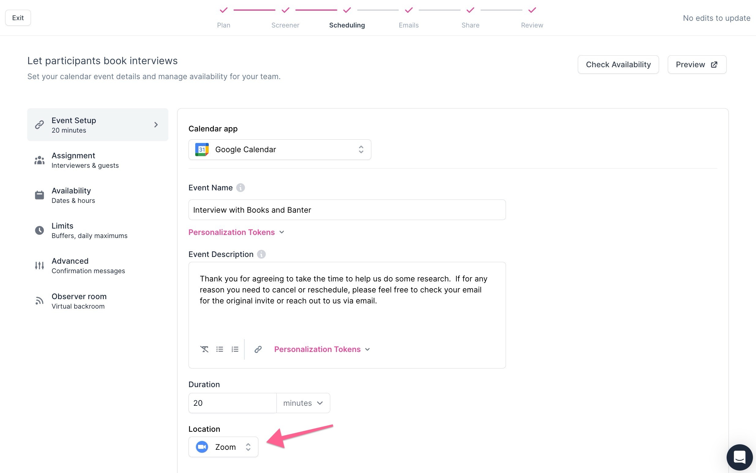 In Scheduling, select Event Setup. You must select either Zoom, Google Meet, or Microsoft Teams as the interview Location to enable Observer Rooms.