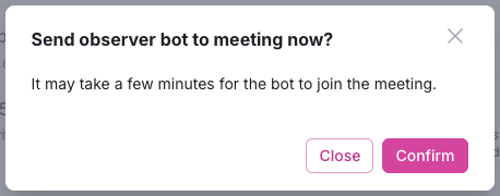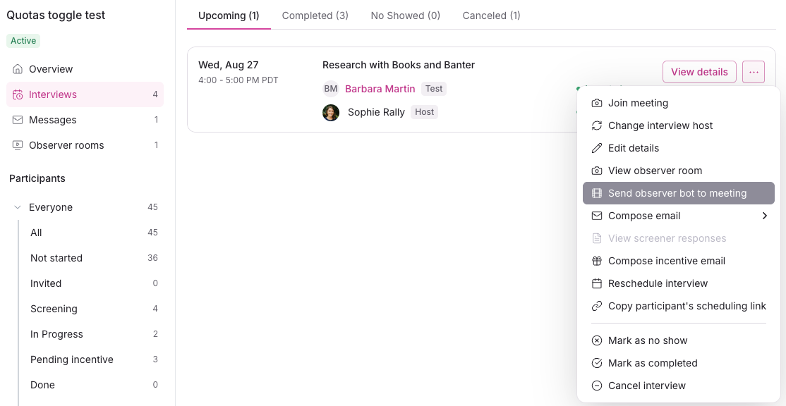 Manually send an observer bot to a meeting from the Interviews page of a study as needed (ex: if you accidentally kicked out the bot early) if Observer Rooms are enabled in study setup.