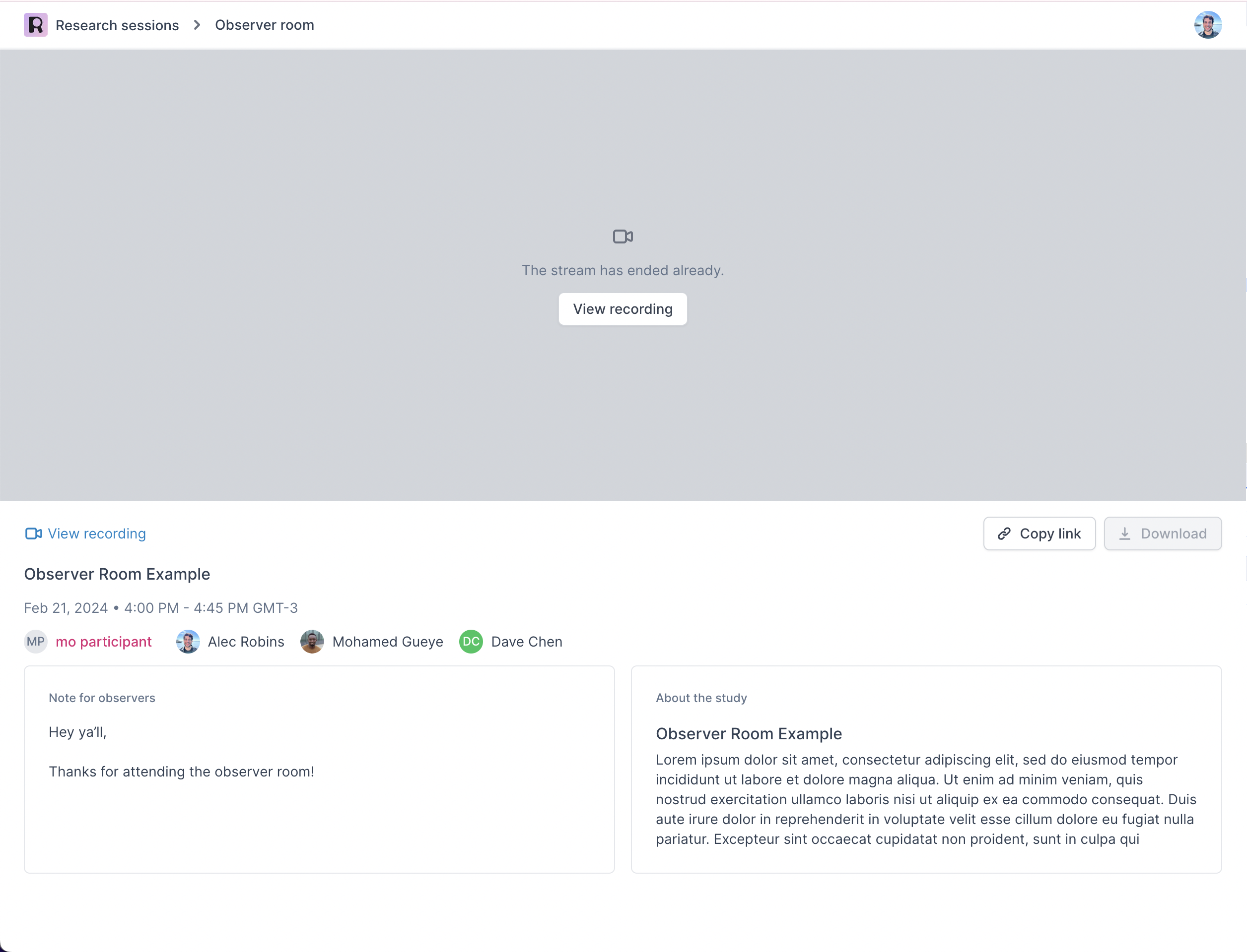 A recording of the interview will be available after the call is complete. Team members or study owners, depending on their role permissions, will be able to view and share a link to the recording page at any time. Your workspace admin can configure who can download recordings in Observer Rooms Settings (admins only, or admins and study owners).